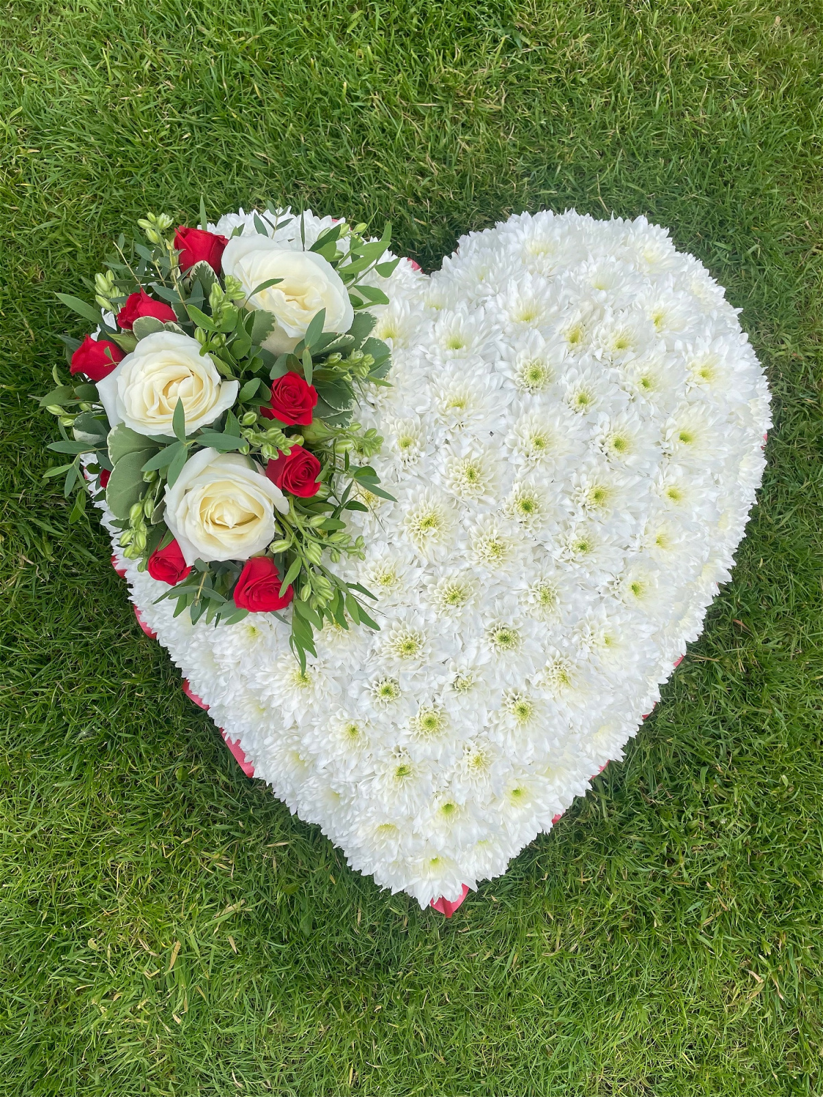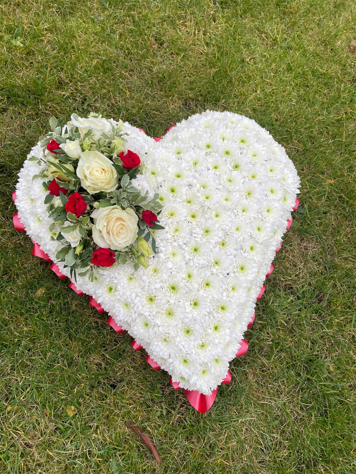 A beautiful full heart arrangement with a seasonal mixed flower spray to compliment your chosen ribbon colour.