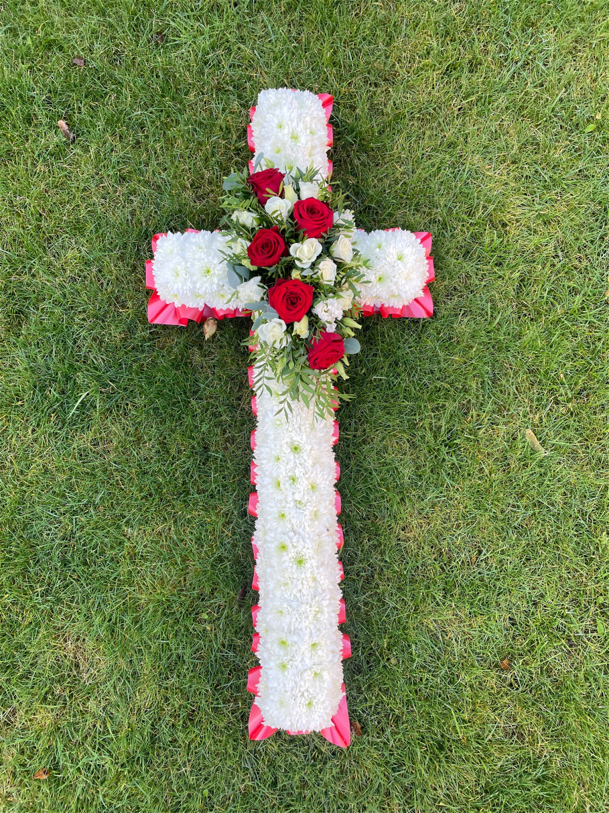 A beautiful cross arrangement with a seasonal mixed flower spray to compliment your chosen ribbon colour.